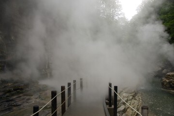 厳美渓から今夜の宿泊地である小安峡温泉へ国道342号線を走る。栗駒山への登山口がある須川温泉辺りは霧がかかりヒンヤリとした空気が心地よい。またこの辺りは岩手・宮城内陸地震(2008年6月14日)の震源地に近く大きな被害のあったところである。磐井川支流の鬼越沢には崩壊した祭畤大橋(まつるべおおはし)が災害遺構として保存され被害の大きさを物語っている。小安峡温泉へ到着した頃には小雨が降り始めていたが、景勝地でもある小安峡の大噴湯を見ることにした。小安峡は雄物川支流の皆瀬川に位置する峡谷である。特に岩の裂け目から湯が噴出している大噴湯は通称「地獄釜」と呼ばれ、小安峡の見どころの一つである。