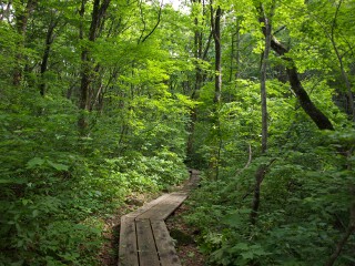 獅子ヶ鼻湿原は中島台レクリェーションの森から遊歩道を歩いたところにある。湧水池を取り囲むように遊歩道が造られており、鳥海マリモや大量の水が湧き出している出つぼ、奇形ブナなどを観察できるので、一度は訪れたい場所である。