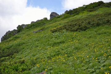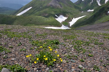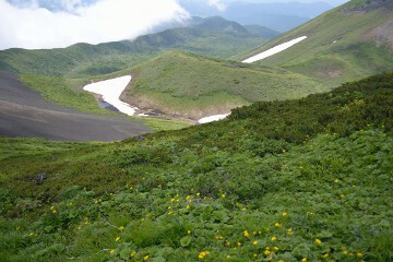 阿仁避難小屋を過ぎるとやや急な登りになる。少し登るとチングルマの群落が広がる稚児平に出る。全体的に綺麗なお花畑と成っているが、所々に植生回復中の場所もある。避難小屋から1時間ほどで山頂に到着。
