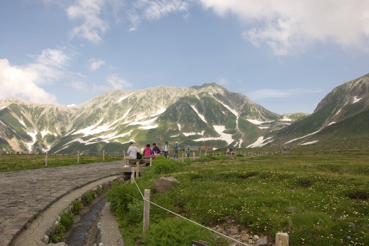 このあたりから階段の急斜面になり、だんだんと高度を上げていく。振り返れば室堂平が見渡せる。