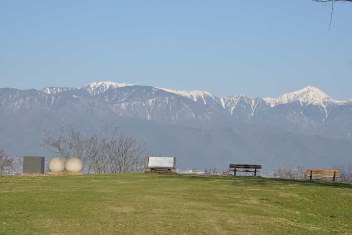桜の木々に合間からは中央アルプスが見える。雪が残る山並みと桜のコントラストが綺麗だ。