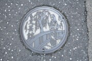 - 大谿川に架かる太鼓橋とサクラが描かれた旧城崎町のマンホール