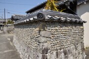 吉良川町まで戻り、国の重要伝統的建造物群保存地区を歩く。明治期に建てられた漆喰壁の商家や水切り瓦の蔵が立ち並ぶ懐かしい町並みが広がる。漆喰の塗屋造りと呼ばれる町家建築の二階部分に、縦に格子状に開口部を設けた虫籠窓(むしこまど)のある家が並んでいる。
