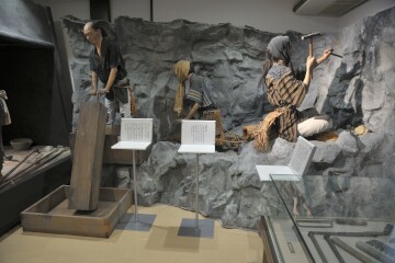 約1200年前からとされる鉱山の歴史、坑の跡やそこで発見された遺物、古文書、道具、写真などが展示されている。藩政時代の鉛精錬や採掘を再現した人形、模型などがあり、鉱山の移り変わりを知る一助となる。