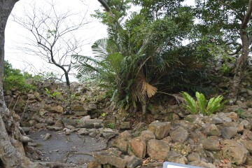 - 高さ2m前後の比較的低い石垣が蛇行して続く
